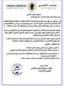تتواصل الجرائم والانتهاكات في مناطق سيطرة الفلول، حيث شهدت ولاية نهر النيل جريمة جديدة هزّت الرأي العام، باغتيال الشاب سليم إبراهيم على يد أحد أفراد القوات النظامية التابعة للجيش السوداني في منطقة التعدين بمدينة دار مالي يوم الثلاثاء 30 سبتمبر 2025.