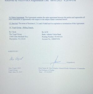 وبموجب الاتفاقية، تتحمل السفارة السودانية جميع نفقات السفر والإقامة والوجبات والنقل المرتبطة بتنفيذ الخدمات، بينما تلتزم شركة فوجل بالامتثال الكامل للقوانين واللوائح الأميركية وتقديم الحماية القانونية للسفارة من أي دعاوى أو غرامات أو التزامات قد تنشأ عن تنفيذ العقد.