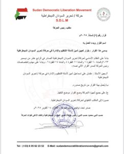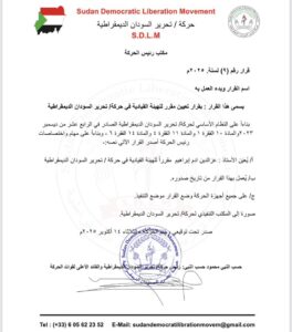 حركة تحرير السودان الديمقراطية تصدر قرارات مهمة تتضمن تعيين عثمان علي إسماعيل أميناً عاماً للتنظيم والإدارة